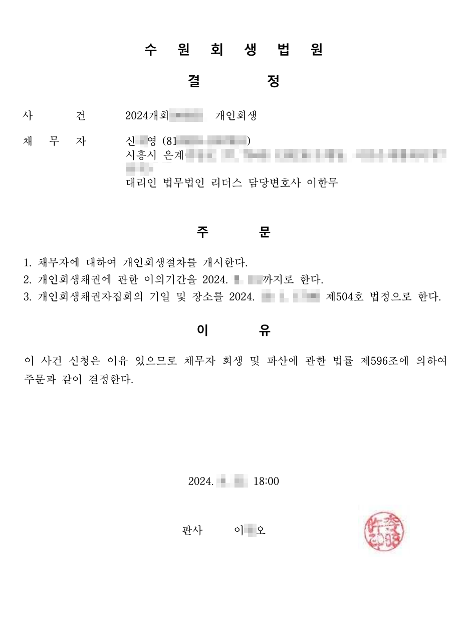 [개시결정] 법무법인 리더스 수원회생법원 신청인 신O영