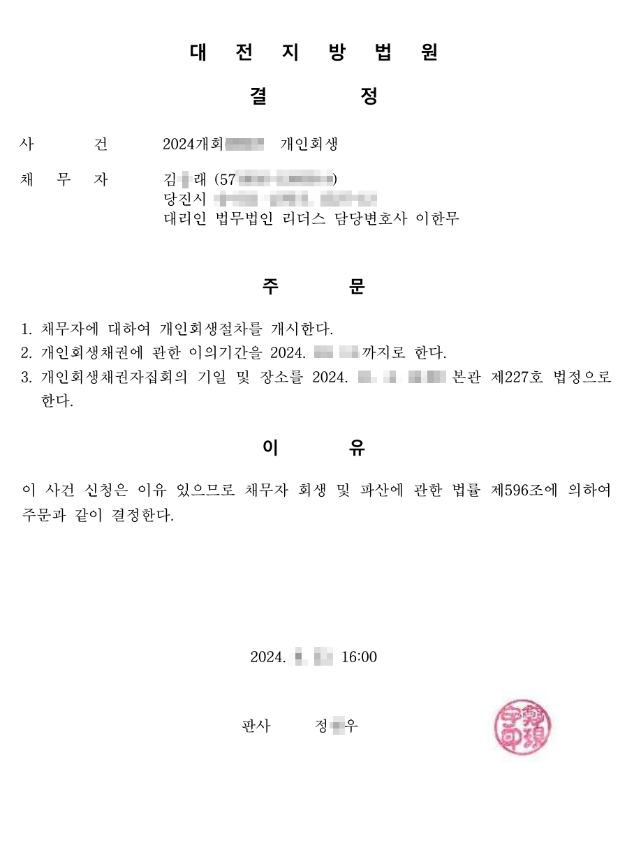 [개시결정] 법무법인 리더스 대전지방법원 신청인 김O래