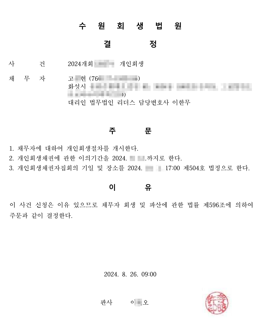 [개시결정] 법무법인 리더스 수원회생법원 신청인 고O현