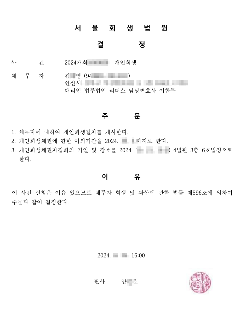 [개시결정] 법무법인 리더스 서울회생법원 신청인 김O영