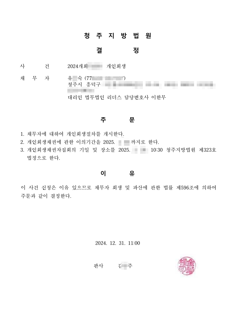 [개시결정] 법무법인 리더스 청주지방법원 신청인 유O숙
