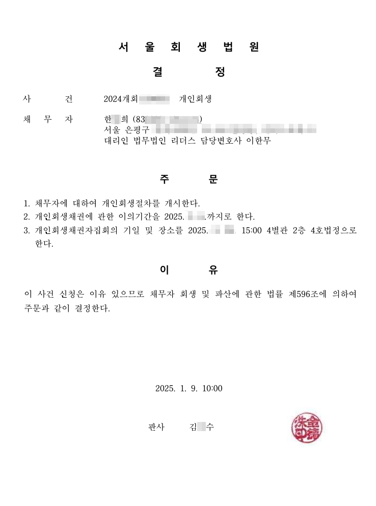 [개시결정] 법무법인 리더스 서울회생법원 신청인 한O희