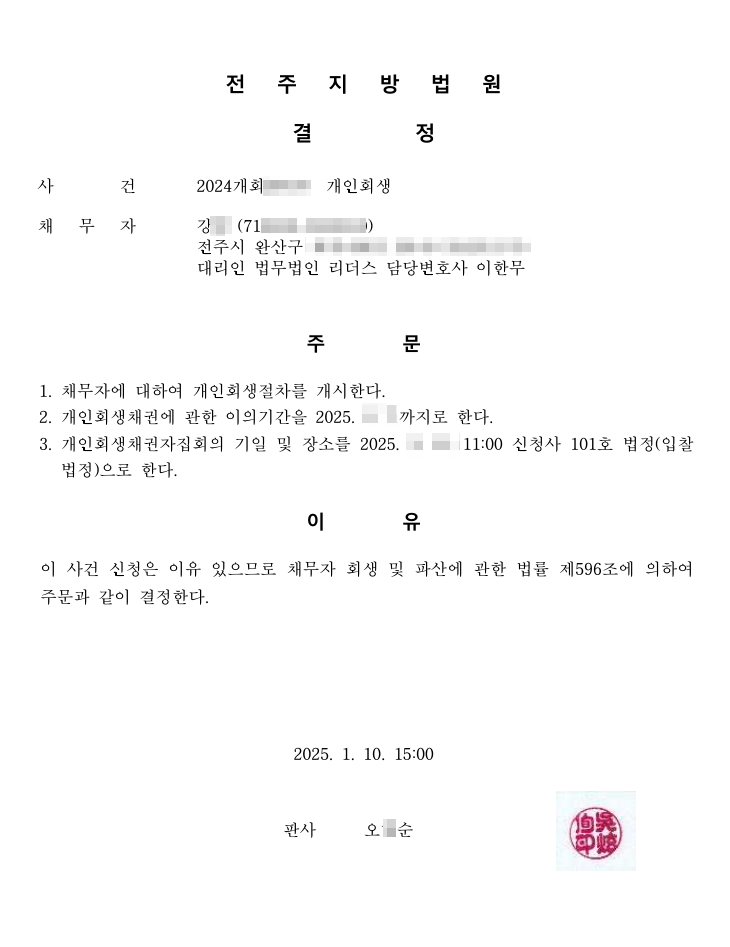 [개시결정] 법무법인 리더스 전주지방법원 신청인 강O