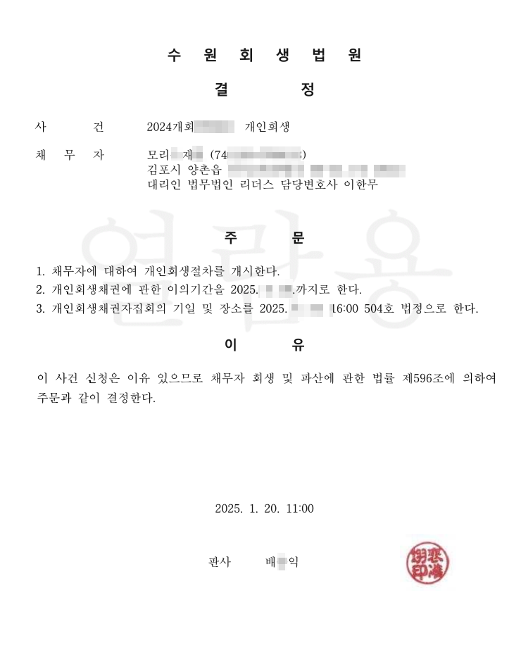 [개시결정] 법무법인 리더스 수원회생법원 신청인 모리O재O