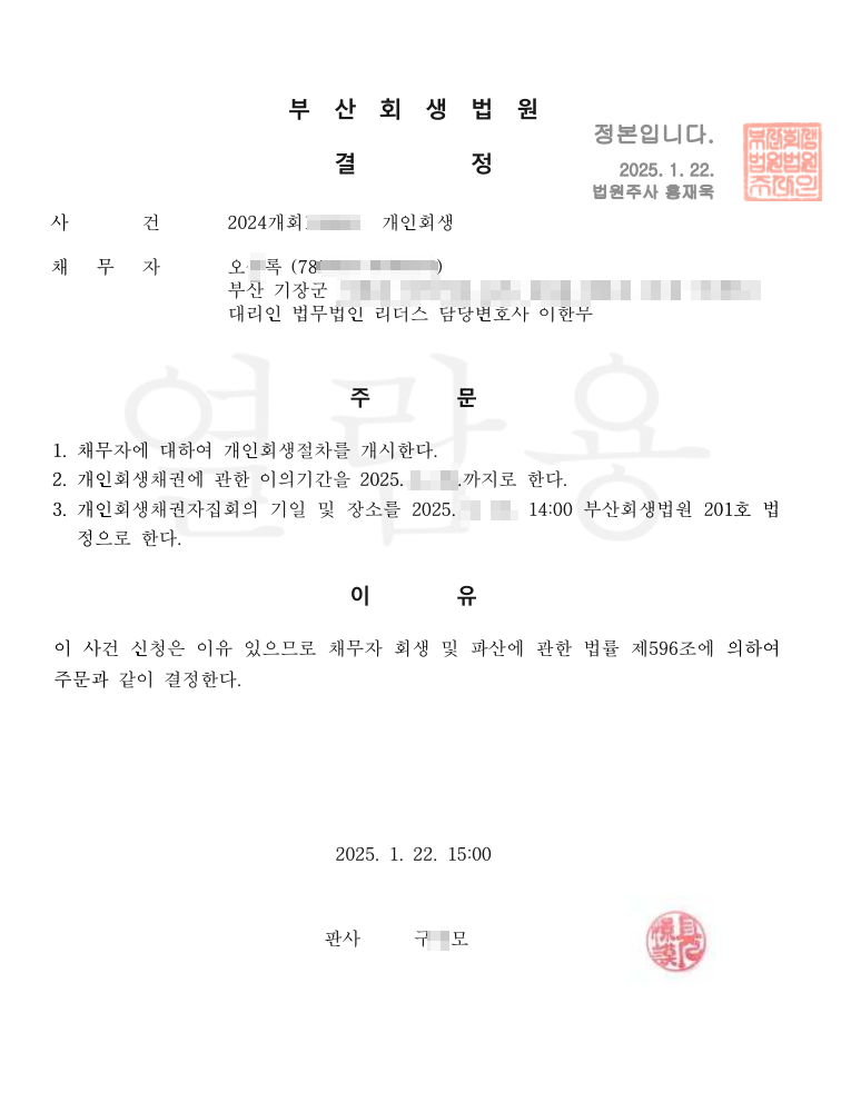 [개시결정] 법무법인 리더스 부산회생법원 신청인 오O록