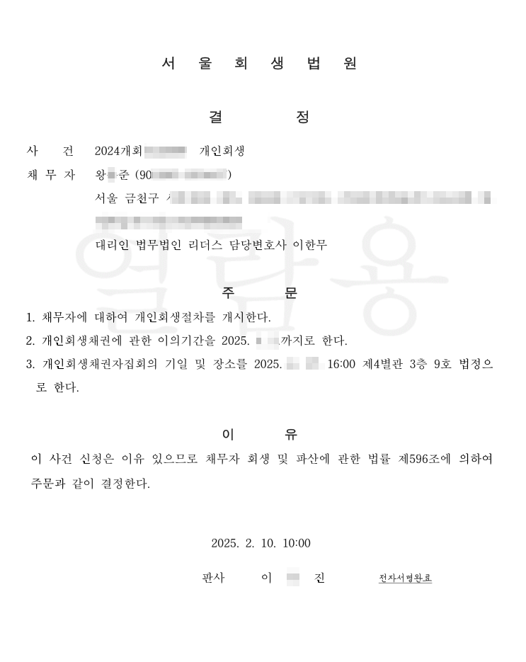 [개시결정] 법무법인 리더스 서울회생법원 신청인 왕O준