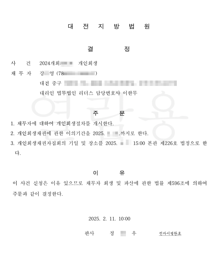[개시결정] 법무법인 리더스 대전지방법원 신청인 강O영