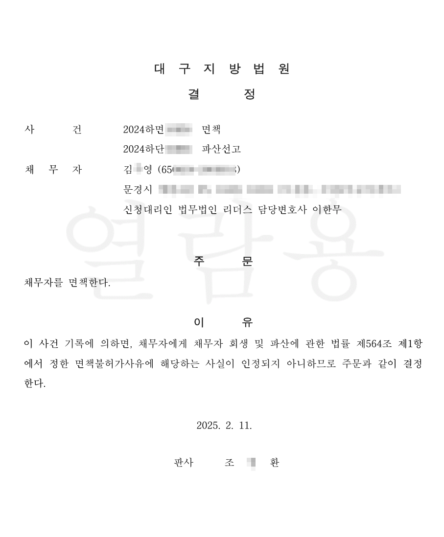 [면책결정] 법무법인 리더스 대구지방법원 신청인 김O영
