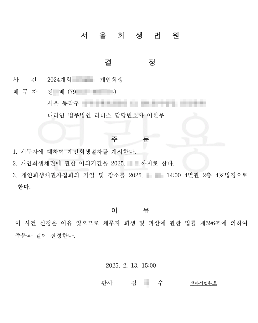 [개시결정] 법무법인 리더스 서울회생법원 신청인 전O배