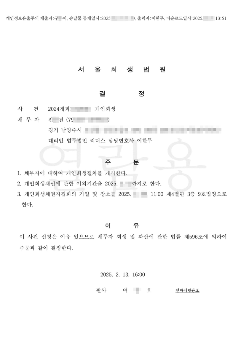 [개시결정] 법무법인 리더스 서울회생법원 신청인 전O진