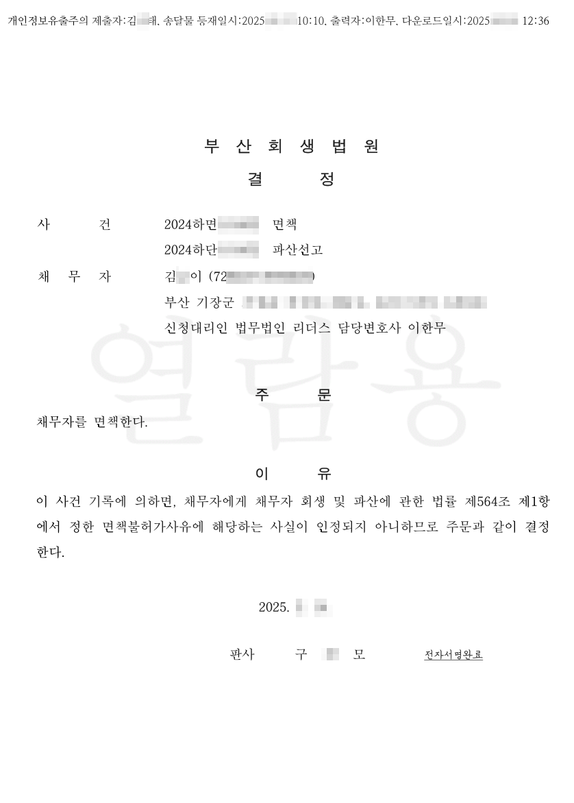 [면책결정] 법무법인 리더스 부산회생법원 신청인 김O이