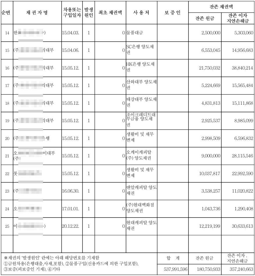 채권현재액 합 계 : 537,991,596 원