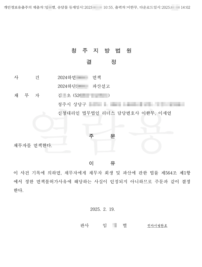 [면책결정] 법무법인 리더스 청주지방법원 신청인 김O초