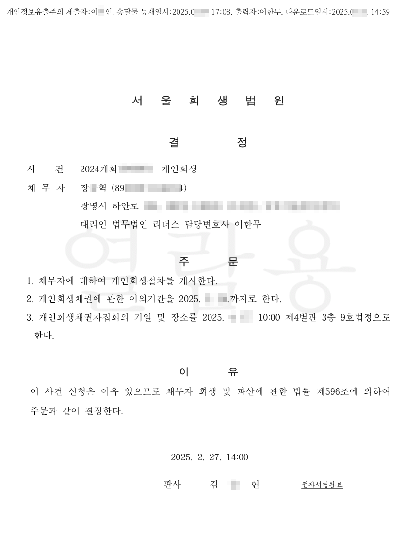 [개시결정] 법무법인 리더스 서울회생법원 신청인 장O혁