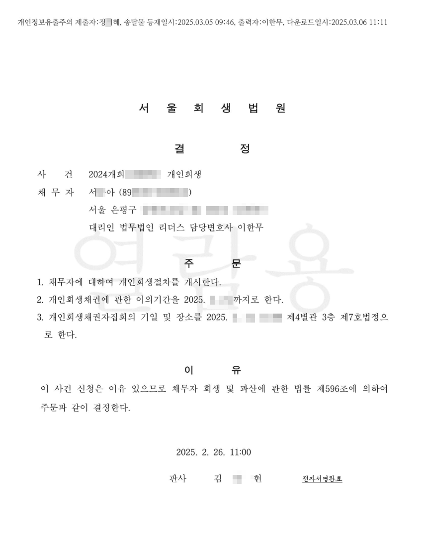[개시결정] 법무법인 리더스 서울회생법원 신청인 서O아