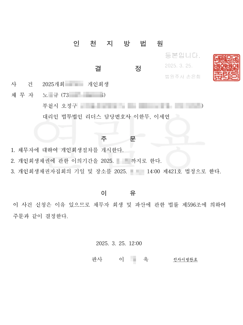 [개시결정] 법무법인 리더스 인천지방법원 신청인 노O규