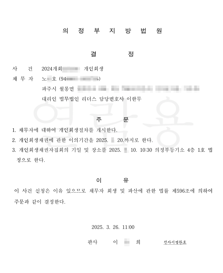 [개시결정] 법무법인 리더스 의정부지방법원 신청인 노O호