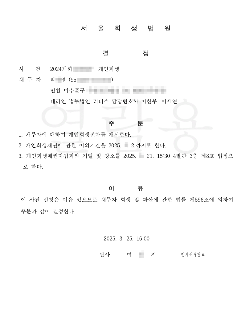 [개시결정] 법무법인 리더스 서울회생법원 신청인 박O영